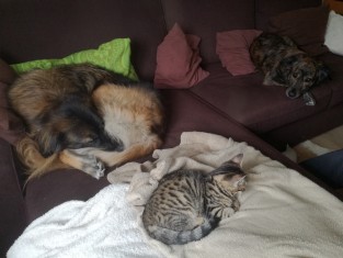 My husband and I live together with Charly & Mila, our wonderful dogs, and Matilda, our enchantingly wild cat lady. All three of them are always waiting with water in their mouths when there's "munchies".